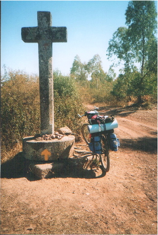 Cruz de San Juan, camino de Alcuescar, en cuya base se pueden observar las piedras que depositan los peregrinos. Observando atentamente, se puede observar, colgando del equipaje, la medalla de la Hermandad de la Virgen del Rocío de Paterna del Campo, que me acompañó todo el Camino. En los eucaliptos de la derecha, algún ciclista desaprensivo, dejó colgando una cámara vieja de bici.