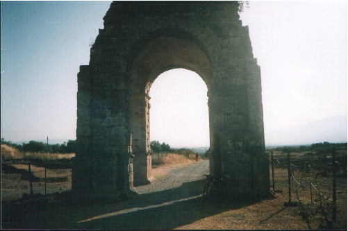 Poco a poco la cañada se va haciendo más estrecha, al tiempo que el camino se hace más húmedo, las encinas desaparecen y el camino se cubre de zarzas, y entre ellas, empieza a ditinguirse, magnífico en du soledad, el Arco de Caparra.