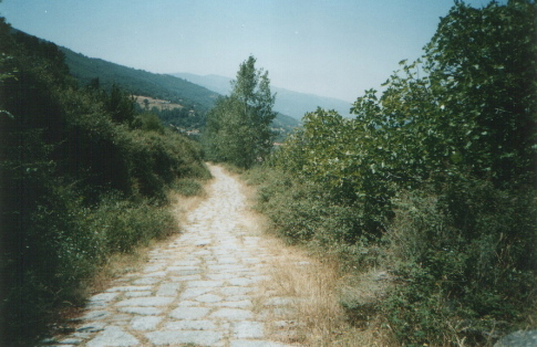 Vista de la subida a Puerto de Bejar por la reconstruida calzada romana. Aunque en la foto no es apreciable, cada cuatro o cinco metros de calzada, me encuentro un pequeño escalón de unos cinco o diez centímetros, que aún dificultan más la subida en bici y con alforjas.