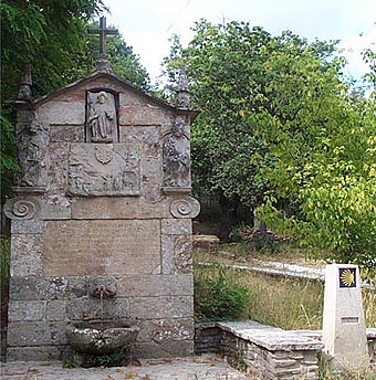 Fuente de Santiaguiño a las espalda de la capilla de mismo nombre. Encima del chorro se puede leer una curiosa inscripción. Está junto al camino y a la derecha se puede observar uno de los mojones con la vieira amarilla sobre fodo azul que indica el camino en Galicia.