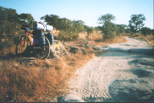 El Camino, poco después de haber dejado atrás el embalse de Proserpina, atravesando una preciosa dehesa, camino del Carrascalejo, en la que se puede observar una flecha amarilla pintada en la roca sobre la que se apoya la bici.
