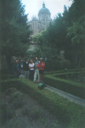Los Jardines de Calixto y Melibea, con las catedrales al fondo, donde se encuentra el albergue. En la foto aparecen tres de lo ciclistas mallorquines, y en el extremo izquierdo y el que se encuentra junto a mi son los dos peregrinos granadinos con los que coincidí en Fuenterroble y en Salamanca. El que se encuentra a mi lado es Paco, perteneciente a la Federación Española de Asociaciones de Amigos del Camino de Santiago, encargado de los hospitaleros.